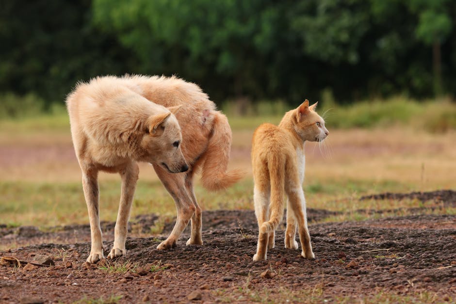 Cute Pets – A dog and a cat standing together outdoors, show #28852102